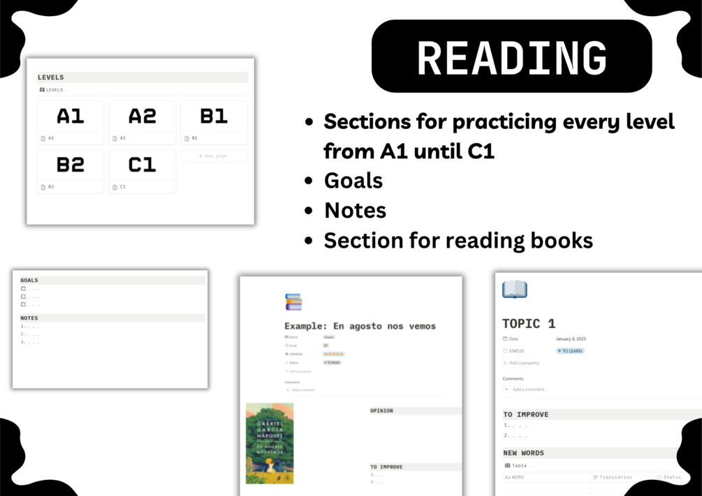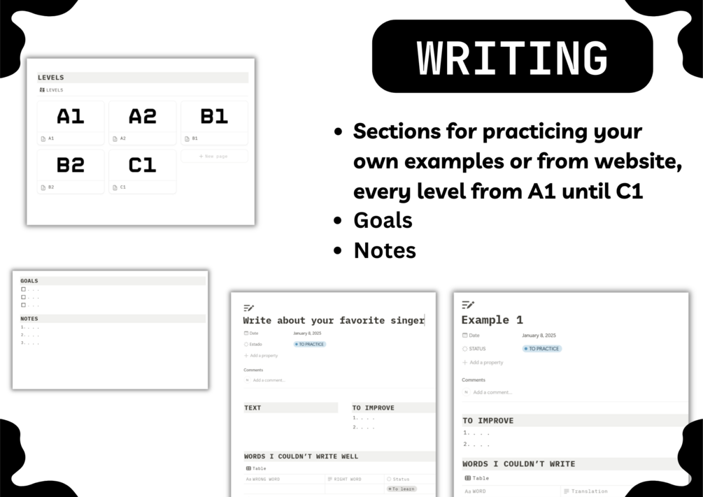 - Structured exercises for A1 to C1 to practice your writing skills.
